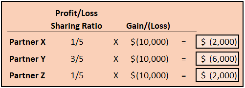 Now that we know that we have a $10,000 gain, our next step will be to decide how much of this gain will be distributed to Partner X, Partner Y, and Partner Z. We will do this according to the partners’ profit/loss sharing ratio.