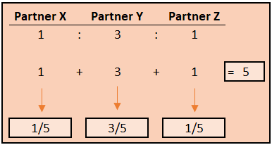 The profit/loss sharing ratio of 1:3:1 essentially tells us that we have 5 parts, and we can use this to create a fraction. Partner X will absorb 1/5 of the loss. Partner Y will absorb 3/5 of the loss, and Partner Z will absorb 1/5 of the loss.